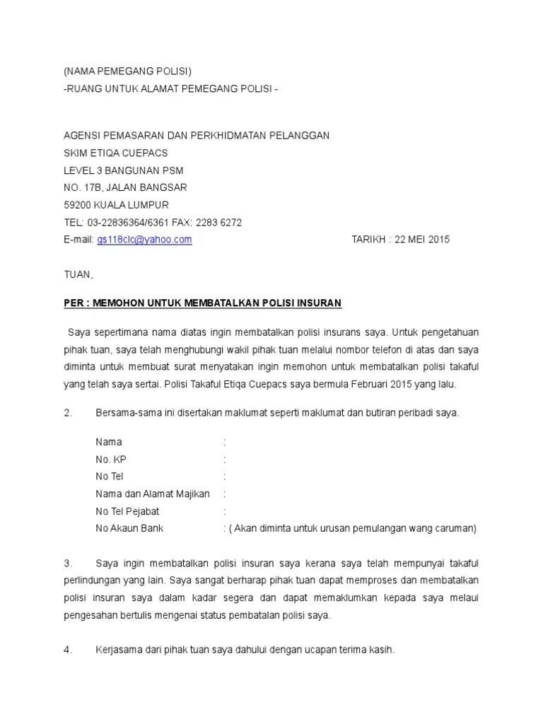Polisi insurans atau perlindungan takaful yang telah contoh surat pembatalan insurans. Malangnya polisi pa tiada pulangan wang atau cash value sama seperti insurans kereta.